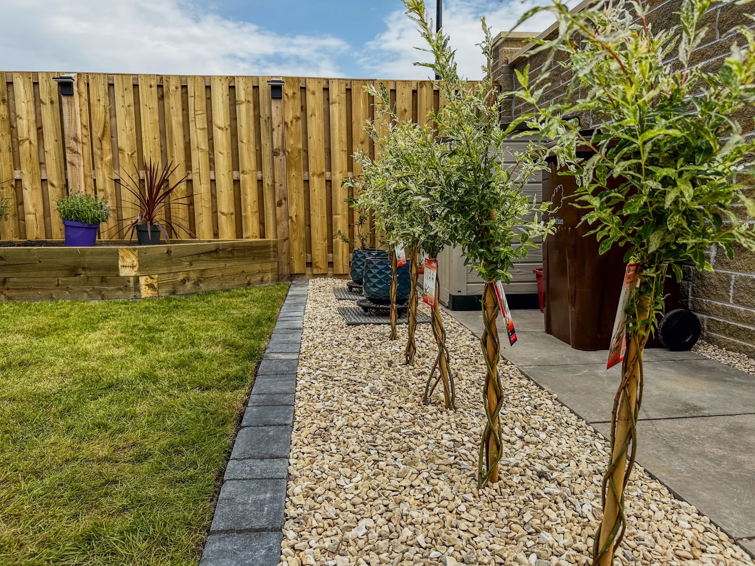 A practical and aesthetic solution to conceal bin storage using vertical screening and evergreen hedging for natural coverage.