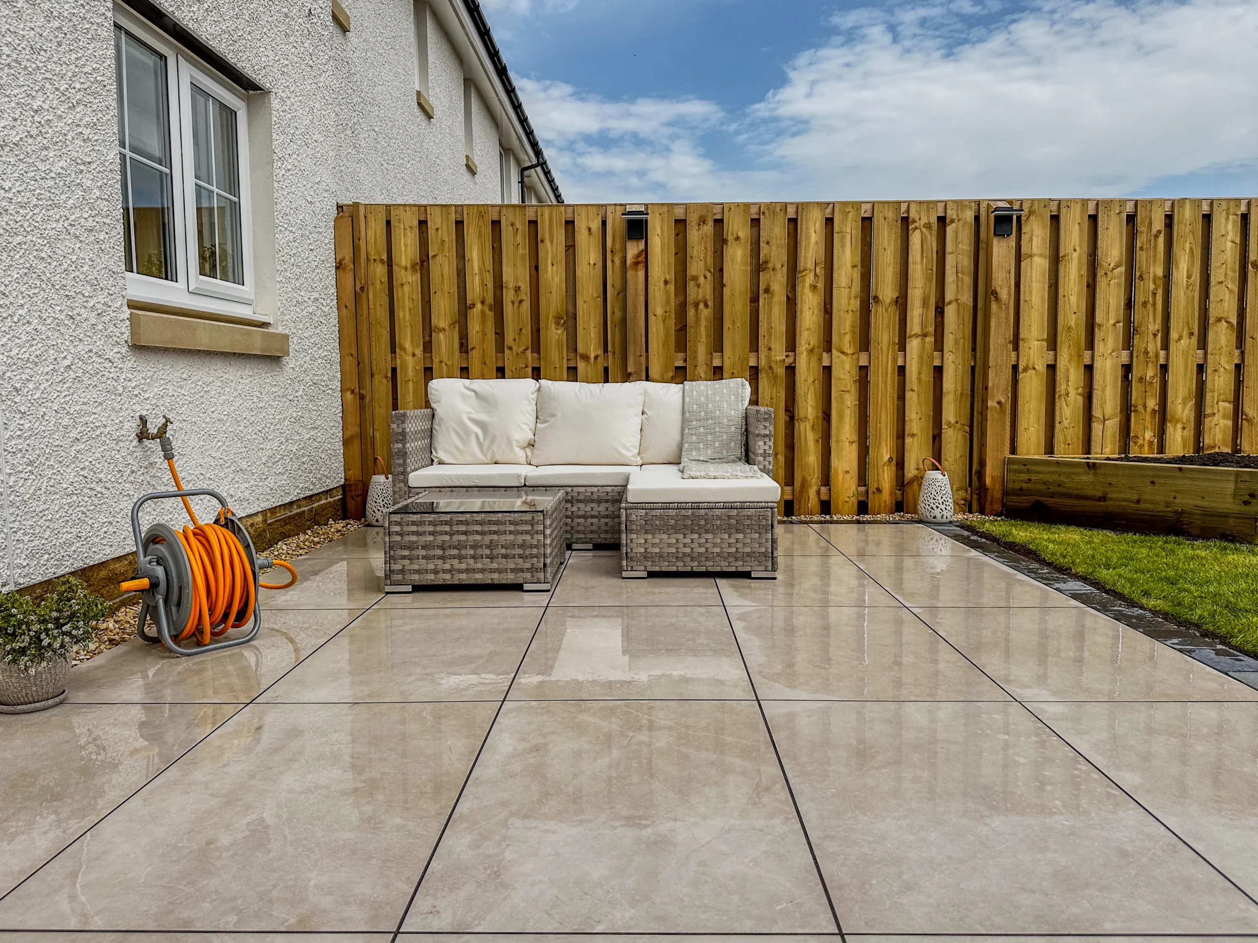 The main patio area features large-format porcelain slabs edged with slate block borders — a clean, modern finish built to last.