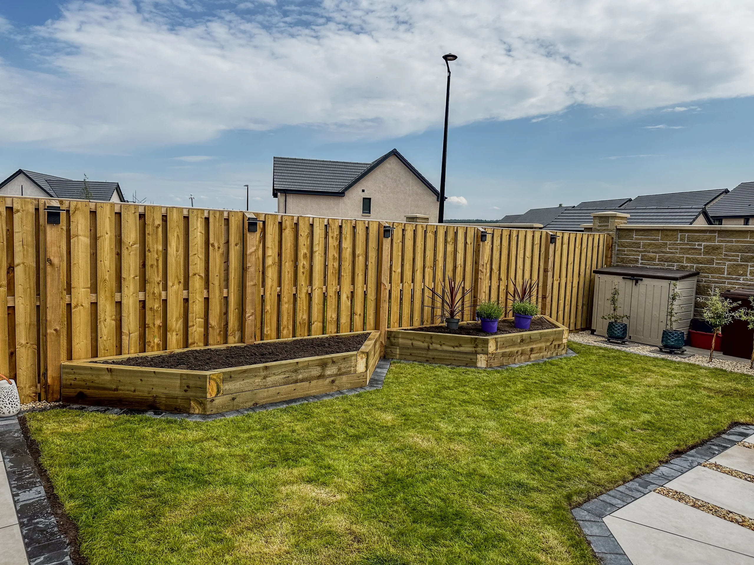 This garden in Midlothian was a full renovation from the ground up. The client wanted a clean, modern layout with defined zones for seating, planting, and storage.